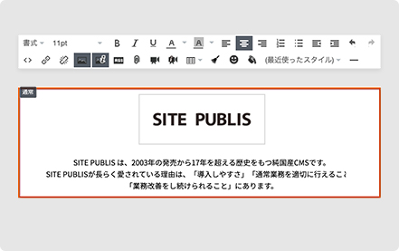 通常ブロックは、任意の文字や画像などを挿入するためのブロックです。ワープロ感覚で操作できるHTMLエディタを搭載しており、編集結果を見ながら直感的に入力できます。 ソースコード表示で直接HTMLコードを編集することも可能です。